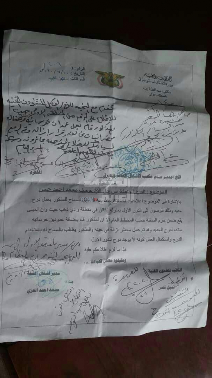 في فضيحة حوثية جديدة، كشفت وثيقة - حصل "المشهد العربي" على نسخة منها - عن توجيهات من وكيل محافظة إب المعين من المليشيا، المدعو عبدالواحد المروعي، بالبناء في حرم أحد مجاري السيول.