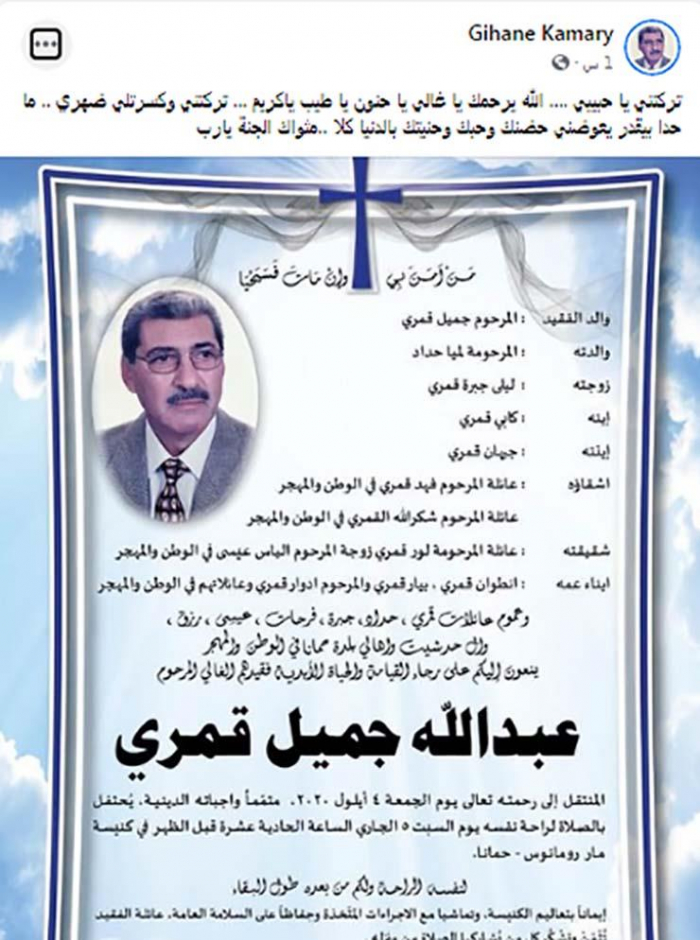 ونعت "جيهان"، والدها بكلمات مؤثرة، إذ قالت: "تركتني يا حبيبي، الله يرحمك يا غالي يا حنون يا طيب يا كريم، تركتني وكسرتلي ضهري، ما حدا بيقدر يعوضني حضنك وحبك وحنيتك بالدنيا كلا، مثواك الجنة يارب".