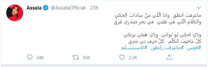 وتزامنا مع حذف جميع منشورات أصالة من "إنستجرام"، نشرت النجمة السورية تغريدة لها عبر حسابها بـ"تويتر"، من كلمات أغنيتها الجديدة "ماعرفت أنطق"، جاء فيها: "ماعرفت انطق وانا اللي من سادات الحكي، والكلام اللي في قلبي في بحر صدري غرق، ودي احكي لو ثواني ودي همي يرتكي، كل ماجيت اتكلم كل حرف بي شرق".