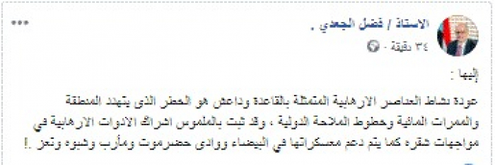 كشف عضو هيئة رئاسة المجلس الانتقالي الجنوبي فضل الجعدي، اليوم، خطورة عودة نشاط العناصر الإرهابية على المنطقة والممرات المائية بعد تواجد مليشيا الإخوان الإرهابية التابعة للشرعية في شقرة.
