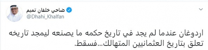 وكتب في تغريدة عبر "تويتر" رصدها "المشهد العربي": "أردوغان عندما لم يجد في تاريخ حكمه ما يصنعه ليمجد تاريخه تعلق بتاريخ العثمانيين المتهالك...فسقط".