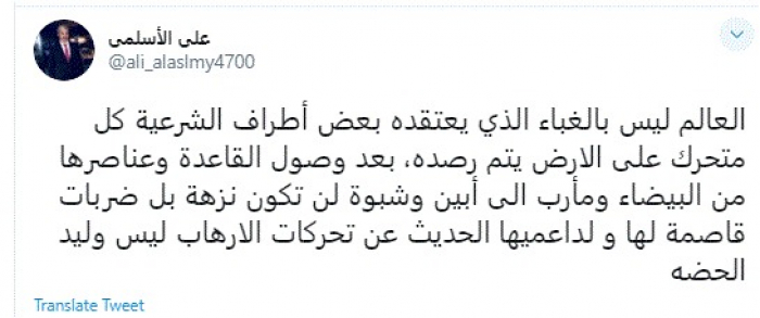 وكتب في تغريدة عبر "تويتر" رصدها "المشهد العربي": "العالم ليس بالغباء الذي يعتقده بعض أطراف الشرعية كل متحرك على الأرض يتم رصده، بعد وصول القاعدة وعناصرها من البيضاء ومأرب إلى أبين وشبوة لن تكون نزهة بل ضربات قاصمة لها ولداعميها الحديث عن تحركات الإرهاب ليس وليد اللحظة".