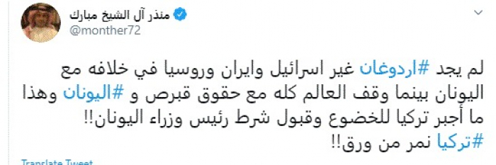 انتقد المدون السعودي البارز منذر آل الشيخ مبارك، اليوم، الرئيس التركي رجب طيب أردوغان بعد خضوعه لشروط اليونان، مؤكدًا أن تركيا نمر من ورق.