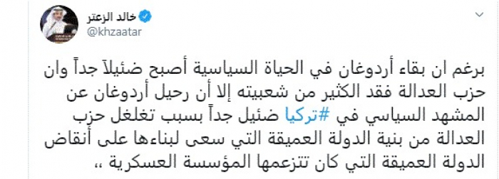 وكتب في تغريدة عبر "تويتر" رصدها "المشهد العربي": "برغم أن بقاء أردوغان في الحياة السياسية أصبح ضئيلاَ جداً وأن حزب العدالة فقد الكثير من شعبيته إلا أن رحيل أردوغان عن المشهد السياسي في تركيا ضئيل جداً بسبب تغلغل حزب العدالة من بنية الدولة العميقة التي سعى لبناءها على أنقاض الدولة العميقة التي كان تتزعمها المؤسسة العسكرية".