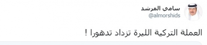 وكتب المرشد عبر تغريدة له على "تويتر" رصدها " المشهد العربي": " العملة التركية الليرة تزداد تدهورا".