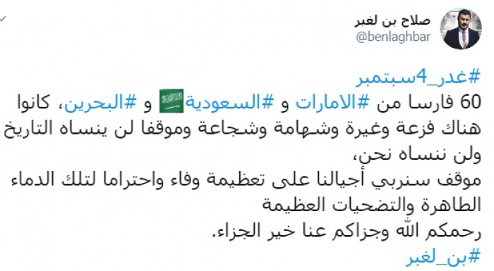 وكتب عبر تغريدة له على "تويتر" رصدها "المشهد العربي": "60 فارسا من الإمارات و السعودية والبحرين، كانوا هناك فزعة وغيرة وشهامة وشجاعة وموقفا لن ينساه التاريخ ولن ننساه نحن، موقف سنربي أجيالنا على تعظيمه وفاء واحتراما لتلك الدماء الطاهرة والتضحيات العظيمة رحمكم الله وجزاكم عنا خير الجزاء".