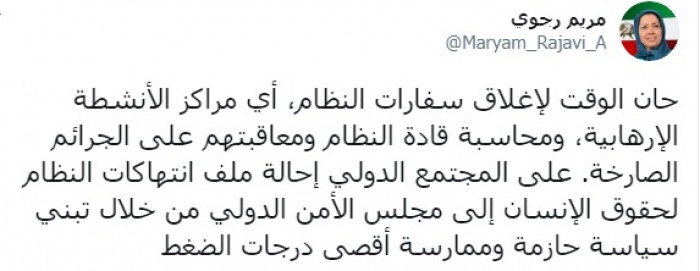 وكتبت عبر تغريدة لها على "تويتر" رصدها " المشهد العربي": "حان الوقت لإغلاق سفارات النظام، أي مراكز الأنشطة الإرهابية، ومحاسبة قادة النظام ومعاقبتهم على الجرائم الصارخة، على المجتمع الدولي إحالة ملف انتهاكات النظام لحقوق الإنسان إلى مجلس الأمن الدولي من خلال تبني سياسة حازمة وممارسة أقصى درجات الضغط".