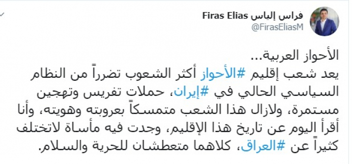 وكتب عبر تغريدة له على "تويتر" رصدها " المشهد العربي": "الأحواز العربية، يعد شعب إقليم الأحواز أكثر الشعوب تضرراً من النظام السياسي الحالي في إيران، حملات تفريس وتهجين مستمرة، ولازال هذا الشعب متمسكاً بعروبته وهويته، وأنا أقرأ اليوم عن تاريخ هذا الإقليم، وجدت فيه مأساة لا تختلف كثيراً عن العراق، كلاهما متعطشان للحرية والسلام".