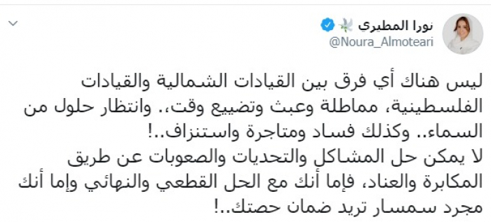 هاجمت الكاتبة والباحثة، نورا المطيري، اليوم الجمعة، القيادات الشمالية، مشيرة إلى أنه لا فرق بينها وبين القيادات الفلسطينية.