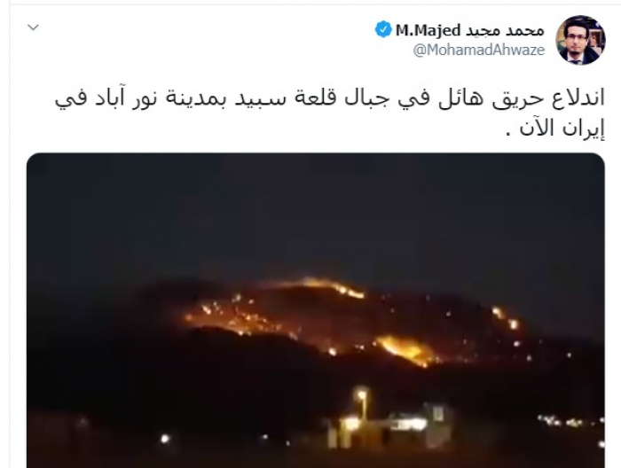وكتب عبر تغريدة له على "تويتر" رصدها " المشهد العربي": "اندلاع حريق هائل في جبال قلعة سبيد بمدينة نور آباد في إيران الآن" .