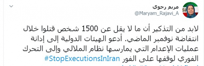 وكتبت عبر تغريدة لها على "تويتر" رصدها " المشهد العربي" :"لابد من التذکیر أن ما لا يقل عن 1500 شخص قتلوا خلال انتفاضة نوفمبر الماضي، أدعو الهيئات الدولية إلى إدانة عمليات الإعدام التي يمارسها نظام الملالي وإلى التحرك الفوري لوقفها على الفور".