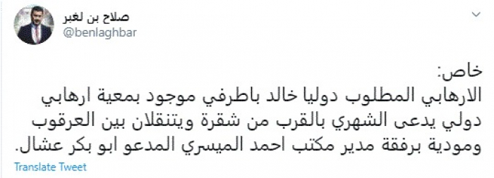 وقال في تغريدة عبر "تويتر" رصدها "المشهد العربي": "خاص: الإرهابي المطلوب دوليًا خالد باطرفي موجود بمعية إرهابي دولي يدعى الشهري بالقرب من شقرة ويتنقلان بين العرقوب ومودية برفقة مدير مكتب أحمد الميسري المدعو أبو بكر عشال".