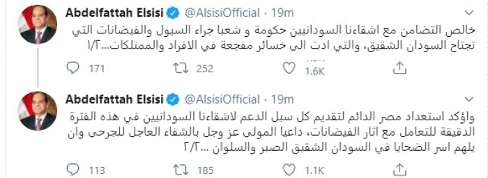 وأضاف: "اؤكد استعداد مصر الدائم لتقديم كل سبل الدعم لأشقاءنا السودانيين في هذه الفترة الدقيقة للتعامل مع آثار الفيضانات، داعيا المولى عز وجل بالشفاء العاجل للجرحى وأن يلهم أسر الضحايا في السودان الشقيق الصبر والسلوان".