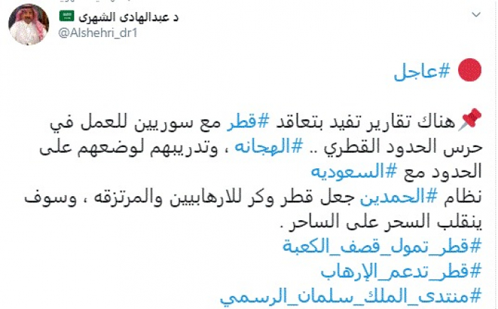 وكتب في تغريدة عبر "تويتر" رصدها "المشهد العربي": "هناك تقارير تفيد بتعاقد قطر مع سوريين للعمل في حرس الحدود القطري .. الهجانه ، وتدريبهم لوضعهم على الحدود مع السعودية".