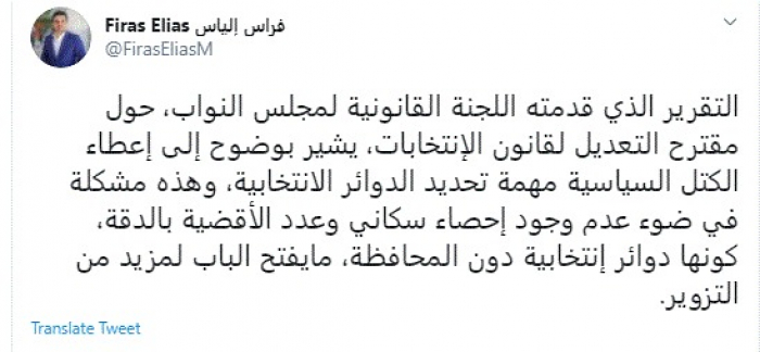 وكتب في تغريدة عبر "تويتر" رصدها "المشهد العربي": "التقرير الذي قدمته اللجنة القانونية لمجلس النواب، حول مقترح التعديل لقانون الإنتخابات، يشير بوضوح إلى إعطاء الكتل السياسية مهمة تحديد الدوائر الانتخابية، وهذه مشكلة في ضوء عدم وجود إحصاء سكاني وعدد الأقضية بالدقة، كونها دوائر إنتخابية دون المحافظة، مايفتح الباب لمزيد من التزوير".