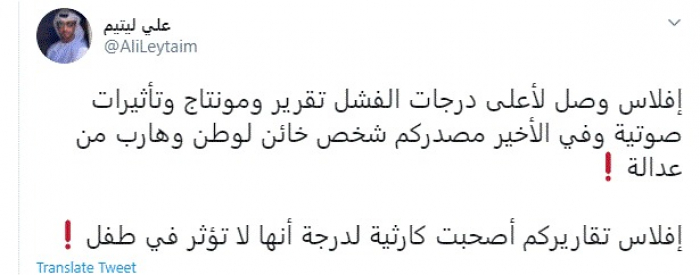 وقال في تغريدة عبر "تويتر" رصدها "المشهد العربي": "إفلاس وصل لأعلى درجات الفشل تقرير ومونتاج وتأثيرات صوتية وفي الأخير مصدركم شخص خائن لوطن وهارب من عدالة.. إفلاس تقاريركم أصحبت كارثية لدرجة أنها لا تؤثر في طفل".
