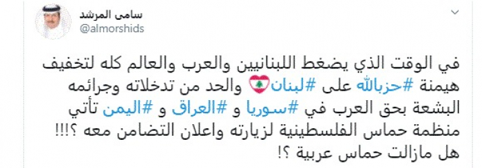 وقال في تغريدة عبر "تويتر" رصدها "المشهد العربي": "في الوقت الذي يضغط اللبنانيين والعرب والعالم كله لتخفيف هيمنة حزب الله على لبنان والحد من تدخلاته وجرائمه البشعة بحق العرب في سوريا والعراق واليمن تأتي منظمة حماس الفلسطينية لزيارته وإعلان التضامن معه ؟ هل ما زالت حماس عربية؟".