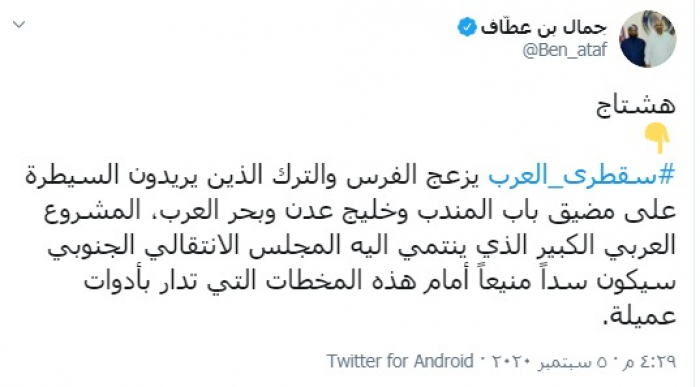 وكتب "بن عطية" تغريدة عبر تويتر، رصدها "المشهد العربي" قال فيها: "#سقطرى _ العرب، يزعج الفرس والترك الذين يريدون السيطرة على مضيق باب المندب وخليج عدن وبحر العرب".