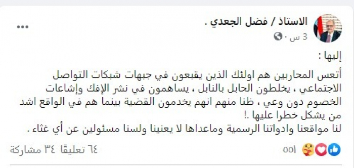 وكتب "الجعدي" منشور عبر موقع التواصل الاجتماعي فيس بوك، تابعه "المشهد العربي": "أتعس المحاربين هم أولئك الذين يقبعون في جبهات شبكات التواصل الاجتماعي ، يخلطون الحابل بالنابل ، يساهمون في نشر الإفك وإشاعات الخصوم دون وعي ، ظنا منهم أنهم يخدمون القضية بينما هم في الواقع أشد من يشكل خطرا عليها".
