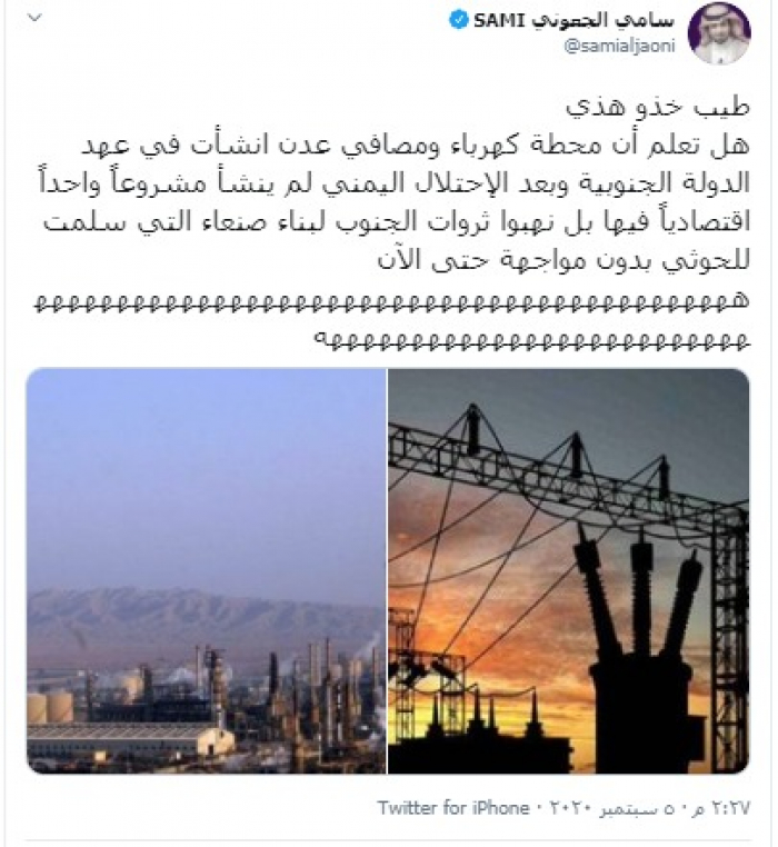 وكتب "الجعوني" في تغريدة عبر تويتر، رصدها "المشهد العربي": "طيب خذوا هذه، هل تعلم أن محطة كهرباء ومصافي عدن أنشأت في عهد الدولة الجنوبية وبعد الاحتلال اليمني لم ينشأ مشروع واحد اقتصادي فيها بل نهبوا ثروات الجنوب لبناء صنعاء التي سلمت للحوثي بدون مواجهة حتى الآن".