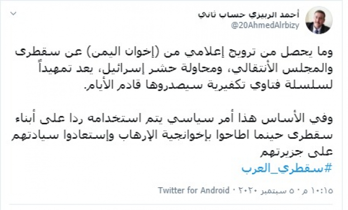 وتابع: "وما يحصل من ترويج إعلامي من (إخوان اليمن) عن سقطرى والمجلس الانتقالي، ومحاولة حشر إسرائيل، يعد تمهيدا لسلسلة فتاوي تكفيرية سيصدروها قادم الأيام".