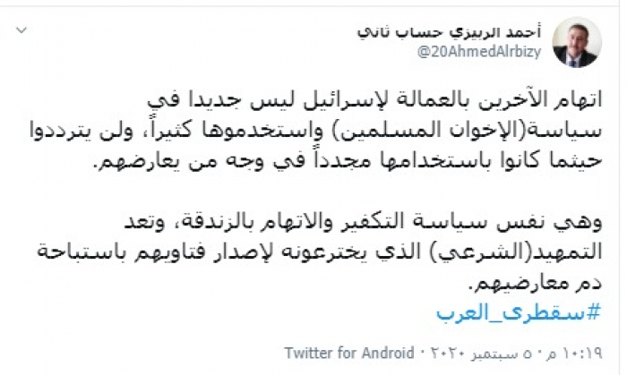 وكتب "الربيزي" في تغريدة عبر تويتر، رصدها "المشهد العربي": "اتهام الآخرين بالعمالة لإسرائيل ليس جديدا في سياسة(الإخوان المسلمين) واستخدموها كثيرا، ولن يترددوا حيثما كانوا باستخدامها مجددا في وجه من يعارضهم.
