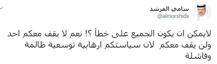 وكتب عبر تغريدة له على "تويتر" رصدها " المشهد العربي": "لايمكن أن يكون الجميع على خطأ، نعم لا يقف معكم أحد ولن يقف معكم لأن سياستكم إرهابية توسعية ظالمة وفاشلة".