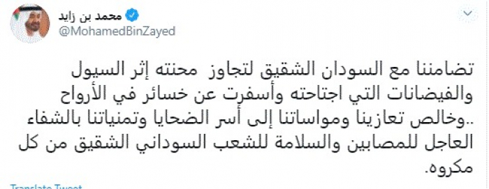 وقال في تغريدة عبر "تويتر" رصدها "المشهد العربي": "تضامننا مع السودان الشقيق لتجاوز محنته إثر السيول والفيضانات التي اجتاحته وأسفرت عن خسائر في الأرواح ..وخالص تعازينا ومواساتنا إلى أسر الضحايا وتمنياتنا بالشفاء العاجل للمصابين والسلامة للشعب السوداني الشقيق من كل مكروه".