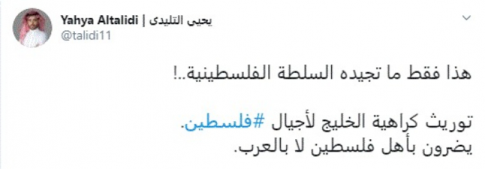 وقال في تغريدة عبر "تويتر" رصدها "المشهد العربي": "هذا فقط ما تجيده السلطة الفلسطينية..! توريث كراهية الخليج لأجيال فلسطين. يضرون بأهل فلسطين لا بالعرب".