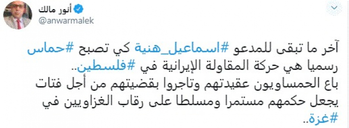 وقال في تغريدة عبر "تويتر" رصدها "المشهد العربي": "آخر ما تبقى للمدعو إسماعيل هنية كي تصبح حماس رسميا هي حركة المقاولة الإيرانية في فلسطين.. باع الحمساويون عقيدتهم وتاجروا بقضيتهم من أجل فتات يجعل حكمهم مستمرا ومسلطا على رقاب الغزاويين في غزة".