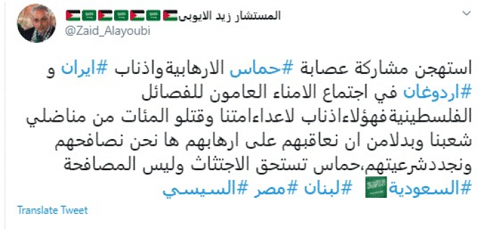 وقال في تغريدة عبر "تويتر" رصدها "المشهد العربي": "استهجن مشاركة عصابة حماس الإرهابية وأذناب إيران وأردوغان في اجتماع الأمناء العامون للفصائل الفلسطينية فهؤلاء أذناب لأعداء أمتنا وقتلوا المئات من مناضلي شعبنا وبدلا من أن نعاقبهم على إرهابهم ها نحن نصافحهم ونجدد شرعيتهم، حماس تستحق الاجتثاث وليس المصافحة".