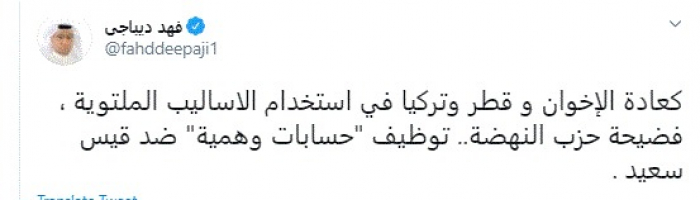 وقال في تغريدة عبر "تويتر" رصدها "المشهد العربي": "كعادة الإخوان وقطر وتركيا في استخدام الأساليب الملتوية، فضيحة حزب النهضة.. توظيف حسابات وهمية ضد قيس سعيد".