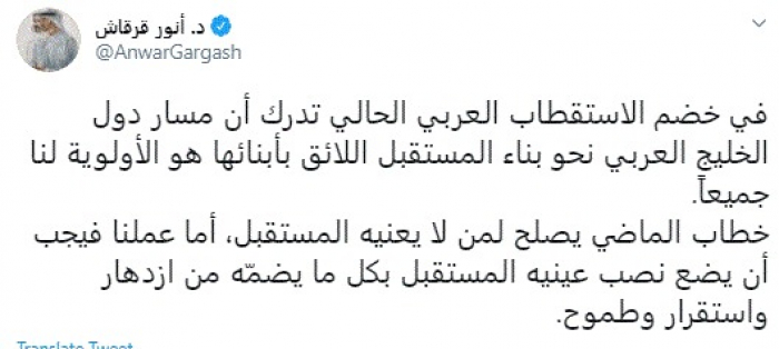 وكتب في تغريدة عبر "تويتر" رصدها "المشهد العربي": "في خضم الاستقطاب العربي الحالي تدرك أن مسار دول الخليج العربي نحو بناء المستقبل اللائق بأبنائها هو الأولوية لنا جميعاً".