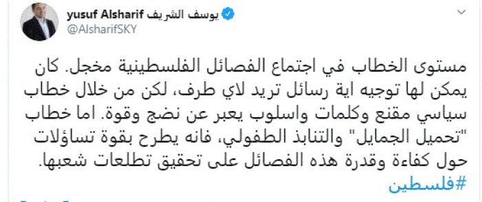 وكتب في تغريدة عبر "تويتر" رصدها "المشهد العربي": "مستوى الخطاب في اجتماع الفصائل الفلسطينية مخجل. كان يمكن لها توجيه أية رسائل تريد لأي طرف، لكن من خلال خطاب سياسي مقنع وكلمات وأسلوب يعبر عن نضج وقوة".