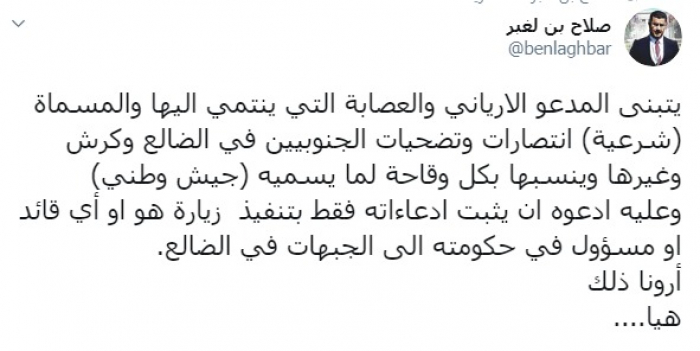 وكتب عبر تغريدة له على "تويتر" رصدها " المشهد العربي": "يتبنى المدعو الإرياني والعصابة التي ينتمي إليها والمسماة (شرعية) انتصارات وتضحيات الجنوبيين في الضالع وكرش وغيرها وينسبها بكل وقاحة لما يسميه (جيش وطني)، وعليه أدعوه أن يثبت ادعاءاته فقط بتنفيذ زيارة هو أو أي قائد أو مسؤول في حكومته إلى الجبهات في الضالع، أرونا ذلك".