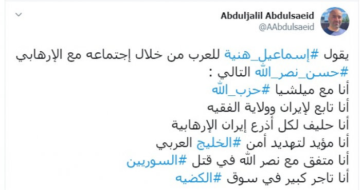 وكتب عبر تغريدة له على "تويتر" رصدها " المشهد العربي": "يقول إسماعيل هنية للعرب من خلال اجتماعه مع الإرهابي حسن نصر الله التالي، أنا مع ميلشيا حزب الله أنا تابع لإيران وولاية الفقيه، أنا حليف لكل أذرع إيران الإرهابية، أنا مؤيد لتهديد أمن الخليج العربي، أنا متفق مع نصر الله في قتل السوريين، أنا تاجر كبير في سوق الكضية".
