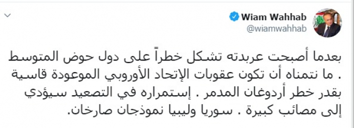 طالب السياسي اللبناني البارز وئام وهاب، اليوم الأحد، الاتحاد الأوروبي بفرض عقوبات قاسية على أردوغان.