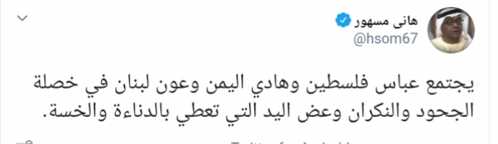 وكتب عبر تغريدة له على "تويتر" رصدها " المشهد العربي": "يجتمع عباس فلسطين وهادي اليمن وعون لبنان في خصلة الجحود والنكران وعض اليد التي تعطي بالدناءة والخسة".