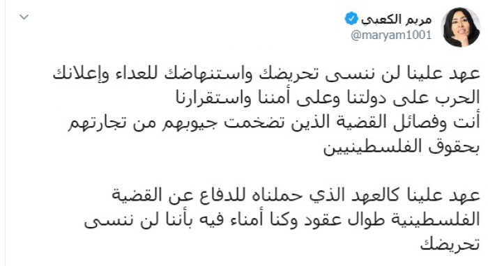 وكتبت عبر تغريدة لها على "تويتر" رصدها " المشهد العربي": "عهد علينا لن ننسى تحريضك واستنهاضك للعداء وإعلانك الحرب على دولتنا وعلى أمننا واستقرارنا، أنت وفصائل القضية الذين تضخمت جيوبهم من تجارتهم بحقوق الفلسطينيين، عهد علينا كالعهد الذي حملناه للدفاع عن القضية الفلسطينية طوال عقود وكنا أمناء فيه بأننا لن ننسى تحريضك".