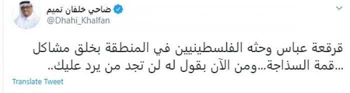 وقال في تغريدة عبر "تويتر" رصدها "المشهد العربي": "قرقعة عباس وحثه الفلسطينيين في المنطقة بخلق مشاكل...قمة السذاجة.. ومن الآن بقول له لن تجد من يرد عليك".