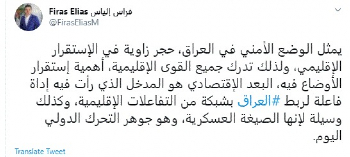 وكتب في تغريدة عبر "تويتر" رصدها "المشهد العربي": "يمثل الوضع الأمني في العراق، حجر زاوية في الإستقرار الإقليمي، ولذلك تدرك جميع القوى الإقليمية، أهمية إستقرار الأوضاع فيه، البعد الإقتصادي هو المدخل الذي رأت فيه إداة فاعلة لربط العراق بشبكة من التفاعلات الإقليمية، وكذلك وسيلة لإنها الصيغة العسكرية، وهو جوهر التحرك الدولي اليوم".