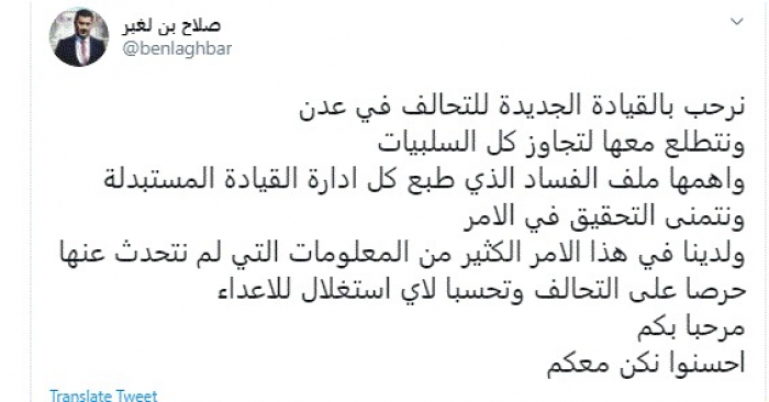 رحب الإعلامي صلاح بن لغبر، اليوم، بالقيادة الجديدة للتحالف في العاصمة عدن.