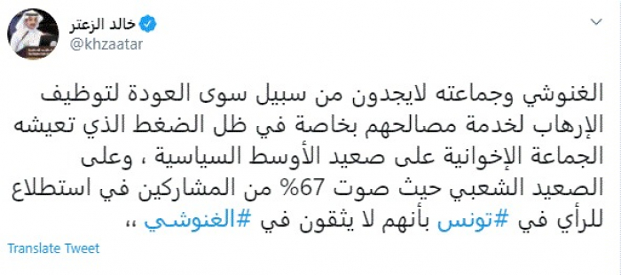 الزعتر: الإخوان لا يجدون سوى الإرهاب للحفاظ على مصالحهم في تونس