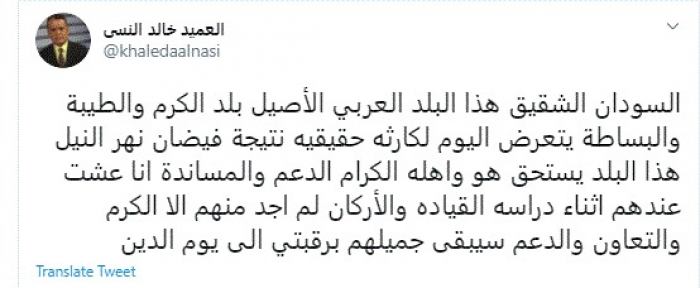 وكتب في تغريدة عبر "تويتر" رصدها "المشهد العربي": "السودان الشقيق هذا البلد العربي الأصيل بلد الكرم والطيبة والبساطة يتعرض اليوم لكارثة حقيقية نتيجة فيضان نهر النيل".