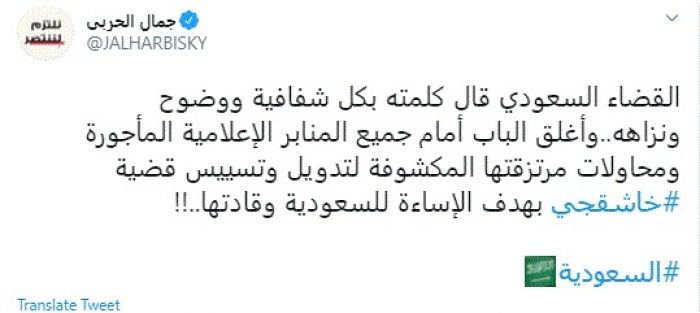 وكتب في تغريدة عبر "تويتر" رصدها "المشهد العربي": "القضاء السعودي قال كلمته بكل شفافية ووضوح ونزاهه..وأغلق الباب أمام جميع المنابر الإعلامية المأجورة ومحاولات مرتزقتها المكشوفة لتدويل وتسييس قضية خاشقجي بهدف الإساءة للسعودية وقادتها".