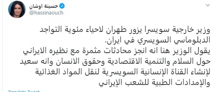 وقالت في تغريدة عبر "تويتر" رصدها "المشهد العربي": "وزير خارجية سويسرا يزور طهران لإحياء مئوية التواجد الدبلوماسي السويسري في إيران".