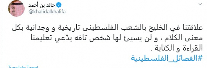 وقال في تغريدة عبر "تويتر" رصدها "المشهد العربي": "علاقتنا في الخليج بالشعب الفلسطينى تاريخية ووجدانية بكل معنى الكلام ، ولن يسيئ لها شخص تافه يدّعي تعليمنا القراءة والكتابة".