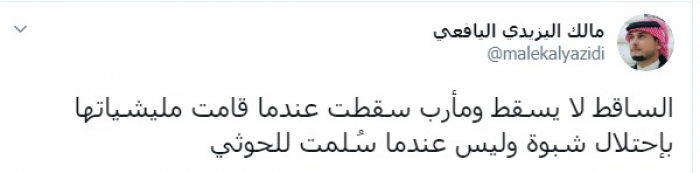 وكتب عبر تغريدة له على "تويتر" رصدها "المشهد العربي": "الساقط لا يسقط ومأرب سقطت عندما قامت مليشياتها باحتلال شبوة وليس عندما سُلمت للحوثي".
