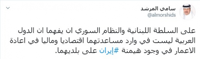 وكتب عبر تغريدة له على "تويتر" رصدها " المشهد العربي": "على السلطة اللبنانية والنظام السوري أن يفهما أن الدول العربية ليست في وارد مساعدتهما اقتصاديا وماليا في إعادة الإعمار في وجود هيمنة إيران على بلديهما".