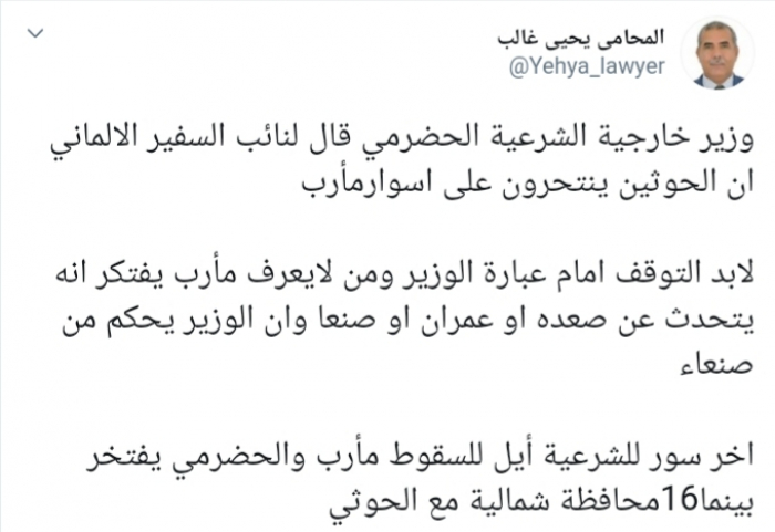 وكتب عبر تغريدة له على "تويتر" رصدها "المشهد العربي": "وزير خارجية الشرعية الحضرمي قال لنائب السفير الألماني إن الحوثيين ينتحرون على أسوار مأرب، لابد من التوقف أمام عبارة الوزير ومن لا يعرف مأرب يفتكر أنه يتحدث عن صعدة أو عمران أو صنعاء وأن الوزير يحكم من صنعاء، آخر سور للشرعية آيل للسقوط مأرب والحضرمي يفتخر بينما 16 محافظة شمالية مع الحوثي".